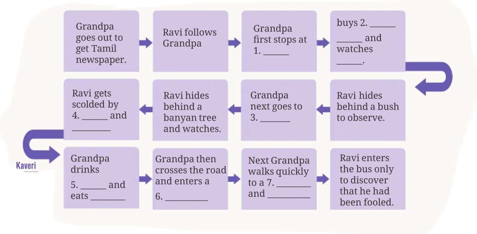 4. Do you think it was easy for Ravi to follow his Grandfather? If yes, why? If no, why not? Answer: No, it was incredibly difficult. Ravi had to crouch behind bushes, crawl on all fours to hide from an angry mother, duck behind cars, get scolded by street vendors, and ultimately sprint to catch a moving bus in the scorching heat.