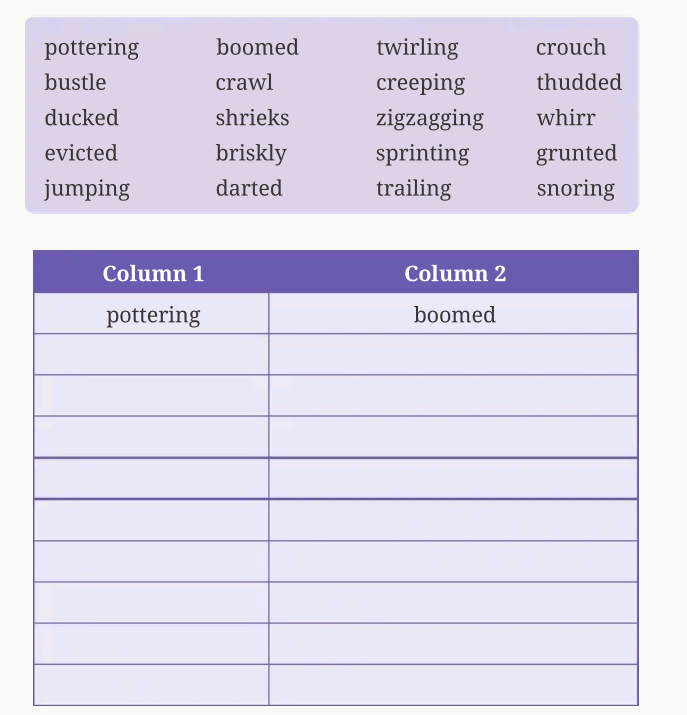 I. Classify the words given in the box into movement words in Column 1 and sound words in Column 2. Then fill in the blanks.