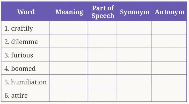 | Word | Meaning | Part of Speech | Synonym | Antonym |