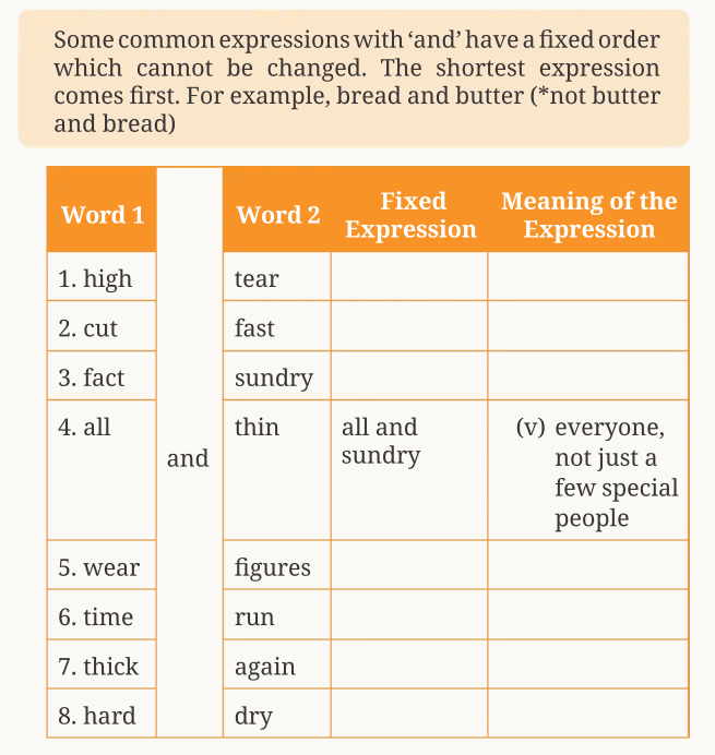 II. Find the word pairs for the following fixed expressions. Write the meanings of these expressions by selecting them from the box given below. One example has been done for you.